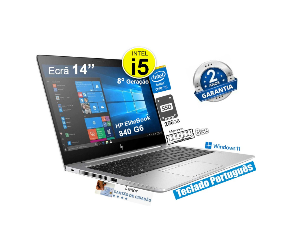 Portátil HP EliteBook 840 G6 | CPU Intel Core i5-8365U | Mem 8GB DDR4 | Disco SSD 256GB | Ecrã 14p FHD | Colunas Bang & Olufsen | Teclado em Português | Win 11 PRO